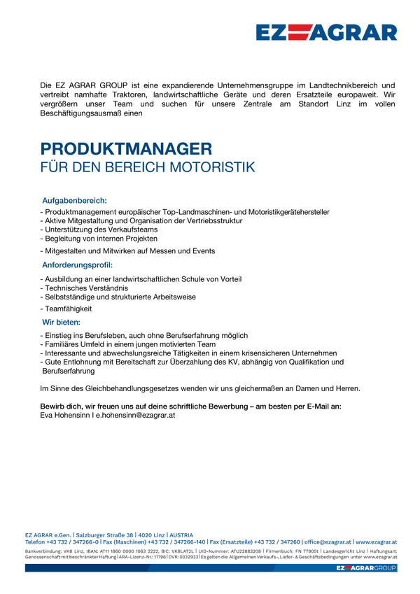 Die EZ AGRAR GROUP ist eine expandierende Unternehmensgruppe im Landtechnikbereich und vertreibt namhafte Traktoren, landwirtschaftliche Geräte und deren Ersatzteile europaweit. Wir vergrößern unser Team und suchen für unsere Zentrale am Standort Linz im vollen Beschäftigungsausmaß einen
